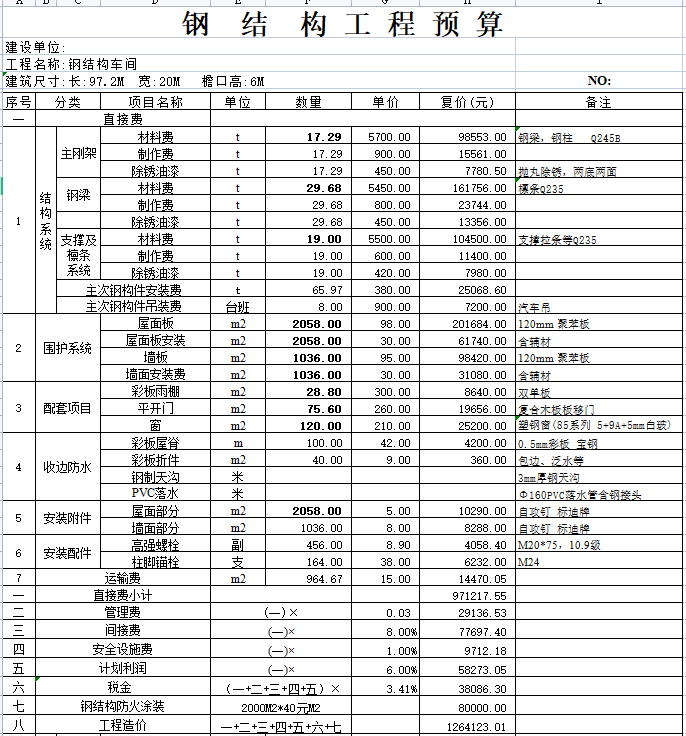 第四步,全部材料统计完成以后就可以计算出材料费、工厂制作费、安装费、油漆费、运费等,再加上其它的间接费就组成了钢结构预算清单。